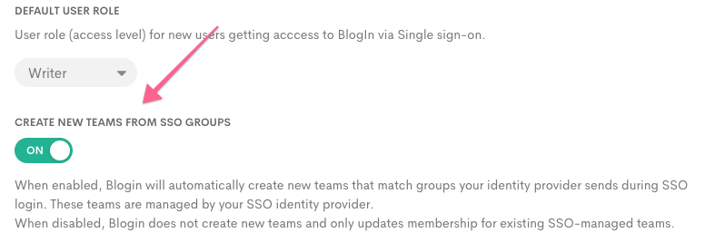 Optionally, Blogin can also automatically create new teams from Google groups. When this option is enabled in your SSO configuration, new teams are created automatically for the groups sent by Google during SSO login and are managed by your SSO identity provider. For example, if you create a new group on Google, the team with the same name will be automatically created on Blogin the first time a user who is a member of the group uses SSO to log in to Blogin, and this user on Blogin will be set to be a member of the newly created team.