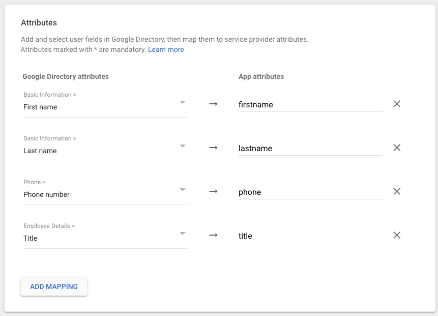 Click ADD NEW MAPPING to add custom mappings for user attributes, like first name, last name, phone number, and job title.