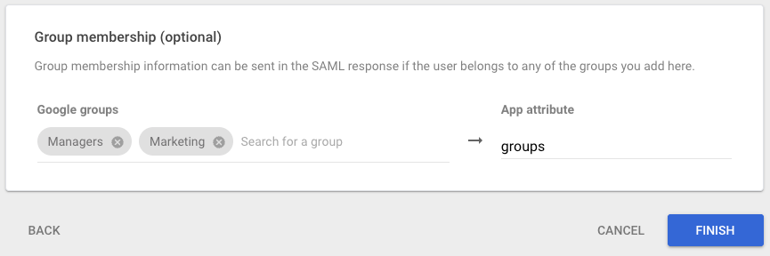 To enable group syncing, you must explicitly select the Google groups you want to share with Blogin in the Google Admin console. Add the relevant groups in the Group membership section and map them to an app attribute (for example, groups). Only the Google groups selected here will be included in the SAML response and available for syncing to teams in Blogin.