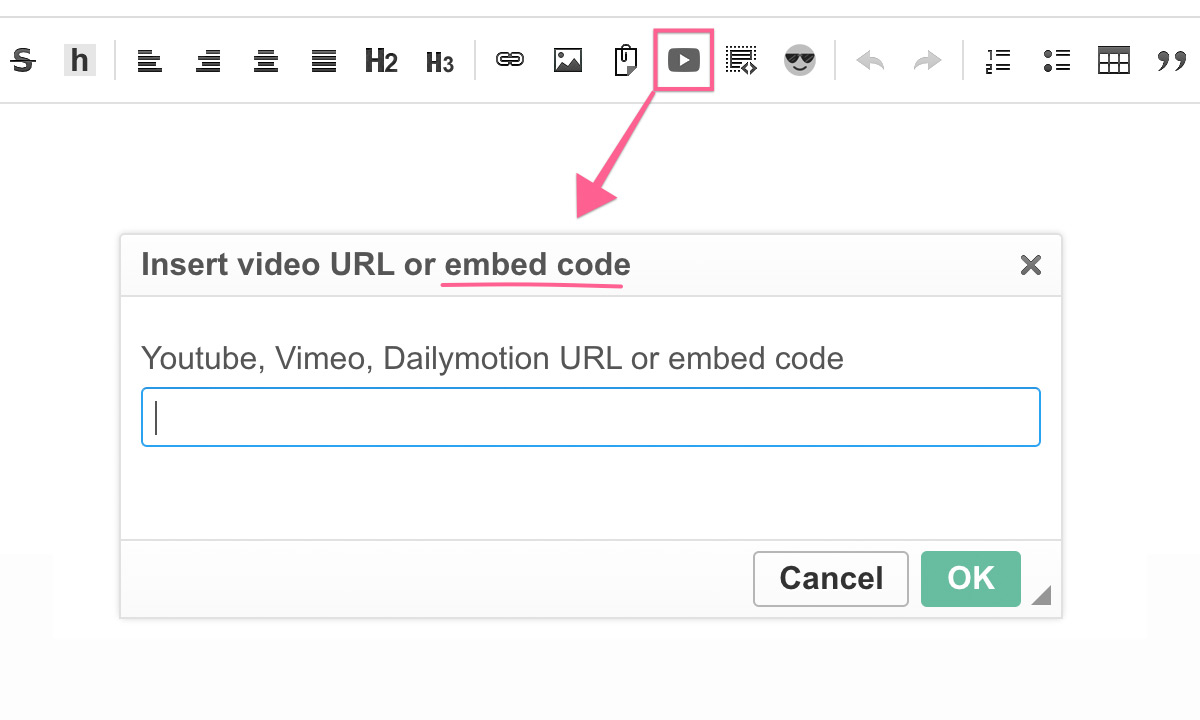 - Paste the embed code into the field in the modal window and click OK