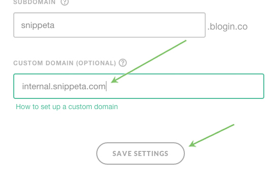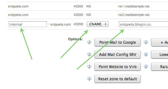 Step 3 – Add a new CNAME record with a subdomain, for example internal.yourdomain.com to point to your BlogIn URL, for example, snippeta.blogin.co