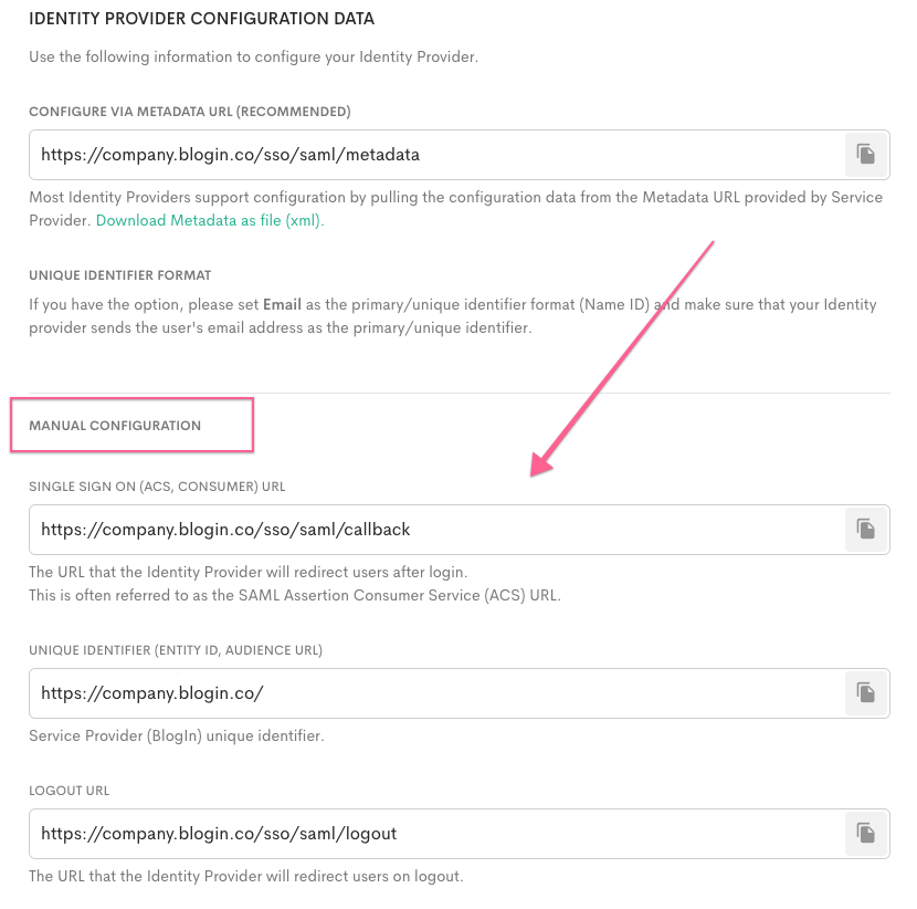 In a new tab or window, log in to your BlogIn account and go to Settings > User Authentication > Configure SSO & User Provisioning.
