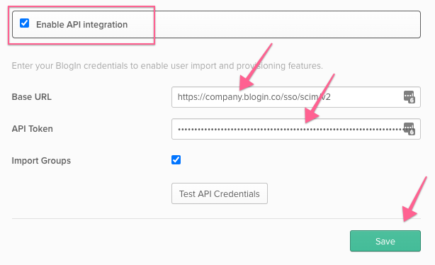 Click the checkbox to Enable API Integration and use Base (Tenant) URL and Secret (Bearer) token from the previous step to configure user provisioning with your Blogin account.