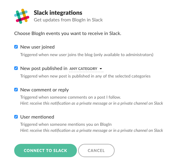 Since this event is related to you and the posts you follow, it usually makes sense to receive this notification as a private message or in a private channel on Slack. - New mention is triggered when someone mentions you in a post, page or comment on BlogIn.